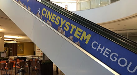 Devido a inauguração do cinema no Parque Shopping Sulacap, participamos da campanha de divulgação, adesivando tapumes, escadas rolantes, mesas da praça de alimentação e portas de entrada.
