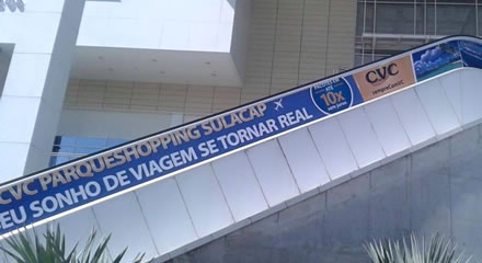 Aplicação adesivo personalizado em escada rolante do Parque Shopping Sulacap.